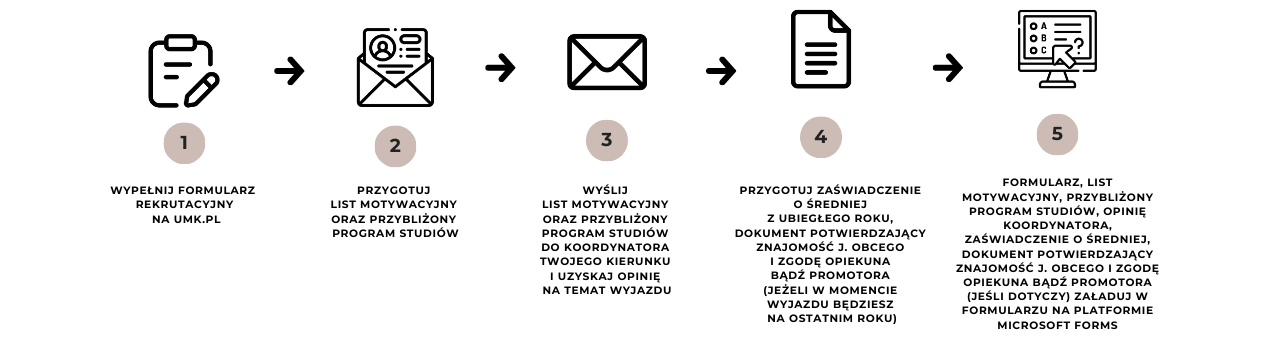- Wypełniony formularz zgłoszeniowy online (umk.pl -> współpraca międzynarodowa -> ERASMUS+ 2021-2027 -> Erasmus + Studia/Studies -> Formularze on-line, przewodniki, ankiety i dokumenty -> Formularz zgłoszeniowy na wyjazd na studia ERASMUS+)