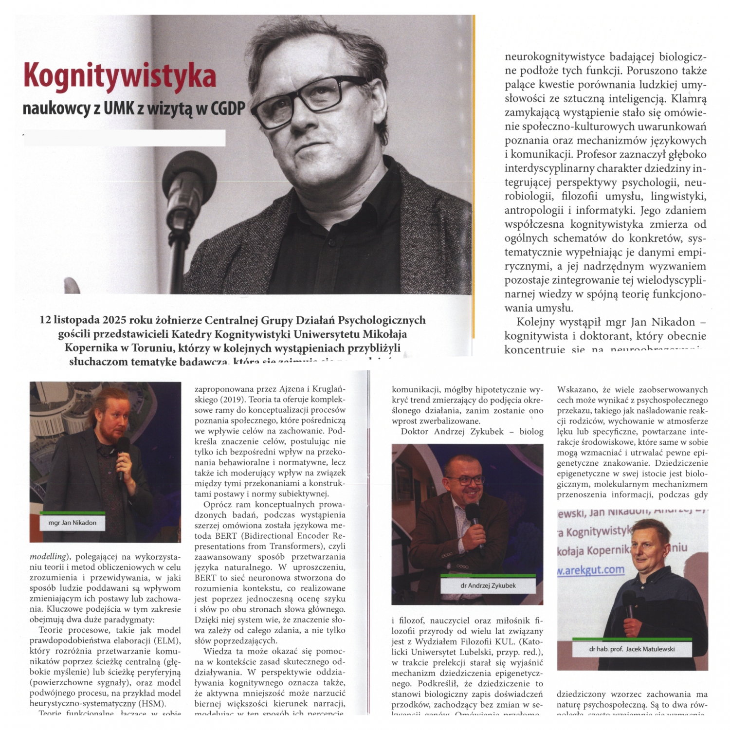 W naszych wykładach i rozmowach z przedstawicielami Centralnej Grupy Działań Psychologicznych, a także Dowódcami Centrum Szkolenia Sił Zbrojnych RP, staraliśmy się pokazać, jak elitarnymi i interdyscyplinarnymi zagadnieniami zajmujemy się w naszych badaniach, jak zaawansowane są nasze badania nad umysłem społecznych, językiem, sieciami społecznymi, mózgiem, psychiką i procesami biologicznymi. Opis naszej wizyty znalazł się branżowym czasopiśmie Centralnej Grupy Działań Psychologicznych „Czarny Pająk”.