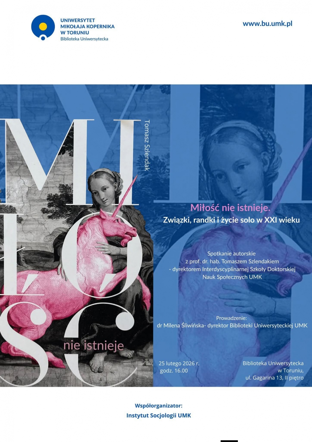 25 lutego br. o godz. 16.00 w Bibliotece Głównej UMK (II piętro) odbędzie się spotkanie z prof. dr. hab. Tomaszem Szlendakiem – pracownikiem naukowym w Instytucie Socjologii UMK, dyrektorem Interdyscyplinarnej Szkoły Doktorskiej Nauk Społecznych na UMK, autorem książki "Miłość nie istnieje. Związki, randki i życie solo w XXI wieku". Rozmowę poprowadzi dr Milena Śliwińska - dyrektorka Biblioteki Uniwersyteckiej w Toruniu.