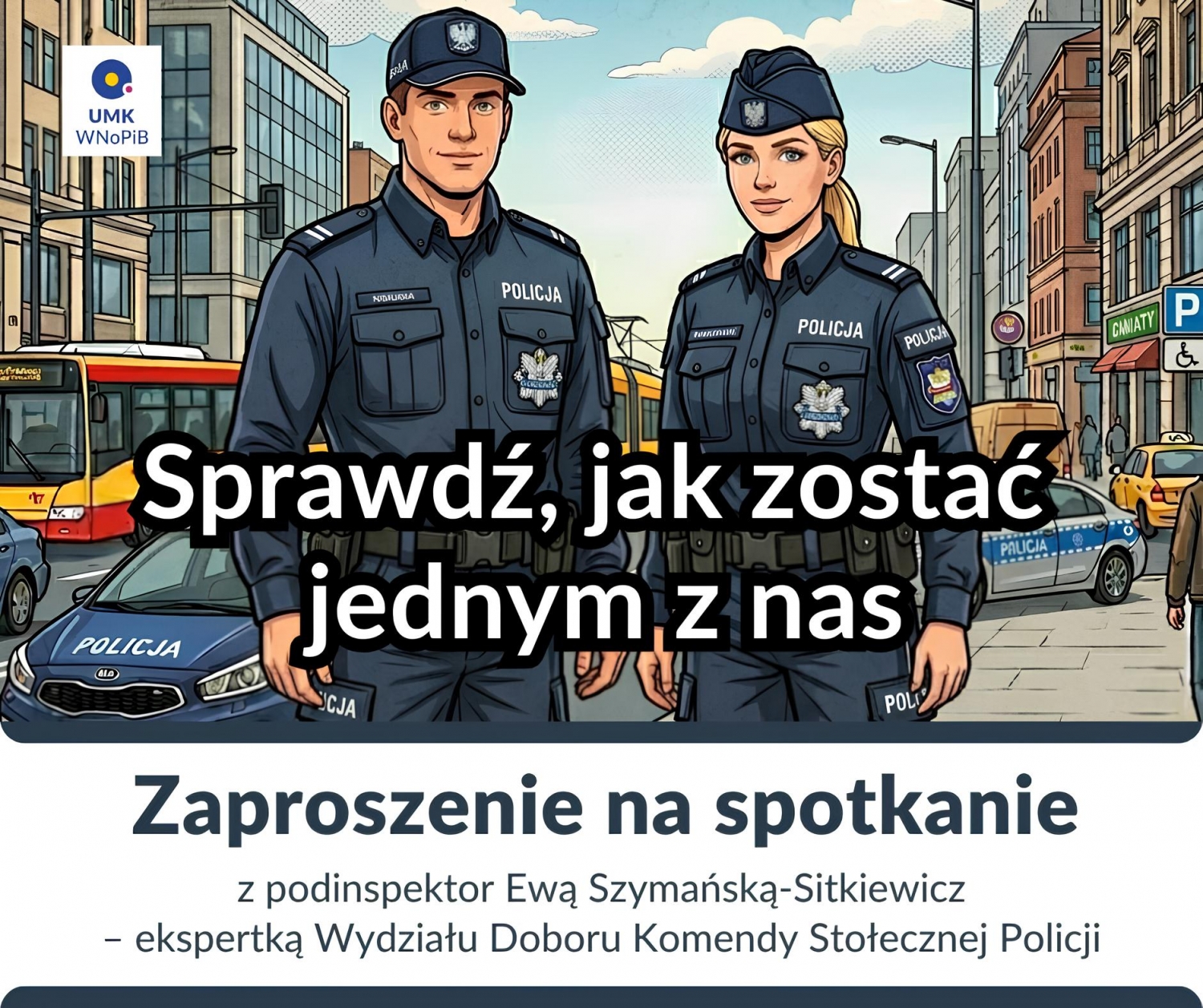 Wydział Nauk o Polityce i Bezpieczeństwie serdecznie zaprasza Studentów wszystkich Wydziałów Uniwersytetu Mikołaja Kopernika w Toruniu na spotkanie z podinspektor Ewą Szymańską-Sitkiewicz, ekspertką Wydziału Doboru Komendy Stołecznej Policji.