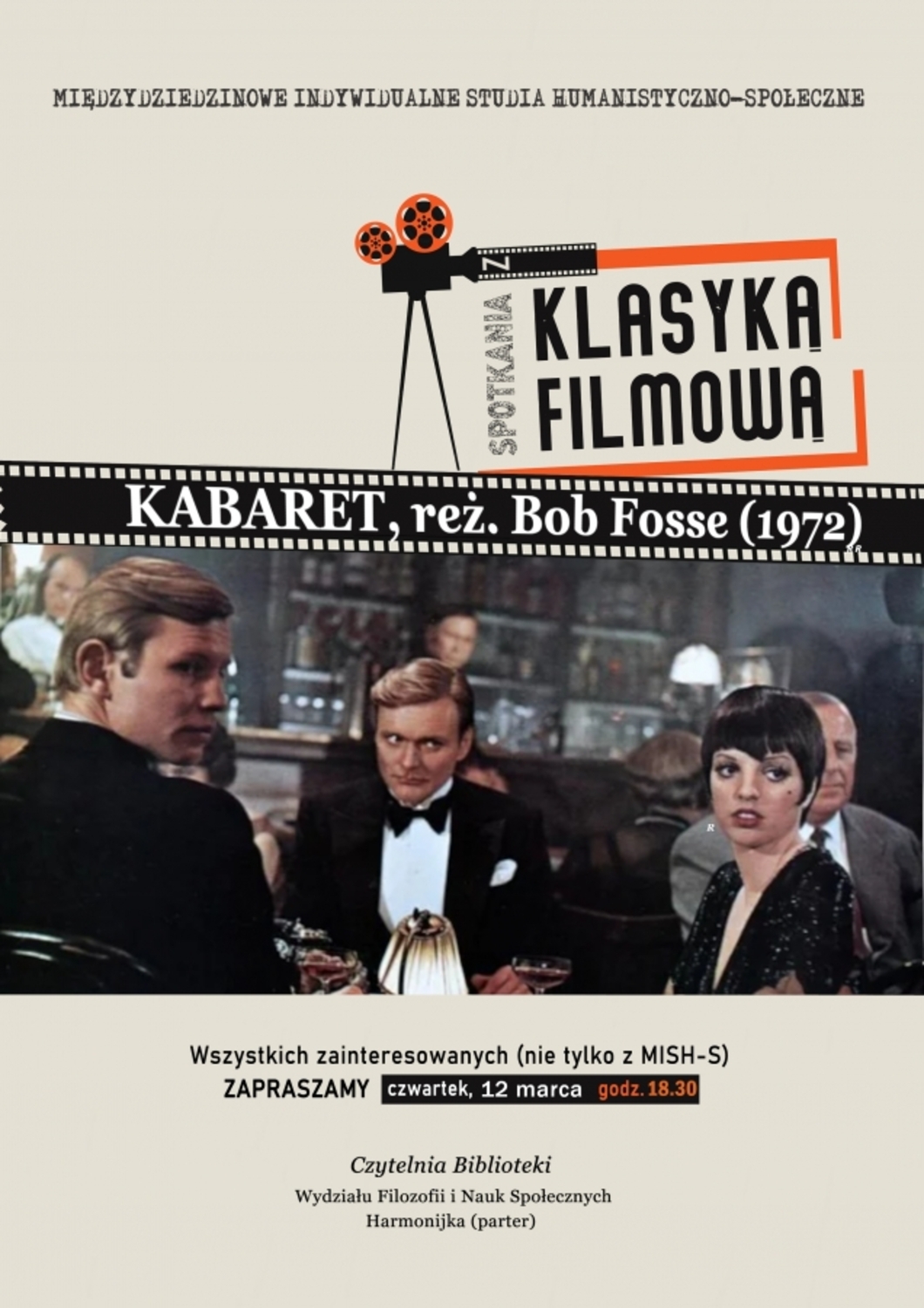 Instytut Filozofii UMK oraz Międzydziedzinowe Indywidualne Studia Humanistyczno-Społeczne zapraszają na kolejne Spotkanie z klasyką filmową. 12 marca (czwartek) o godz. 18.30 w czytelni wydziałowej biblioteki spotykamy się, aby obejrzeć i przedyskutować film Kabaret w reż. Boba Fosse'a z 1972 r. Krótko: kawa, dyskusja, film i filozofia.